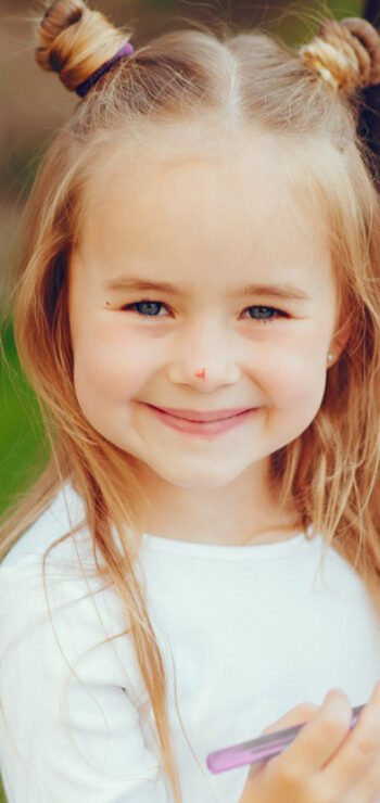 Illustration eines Kindes mit gelben Haaren und Kopfhörern in einem einfachen, bunten Stil.